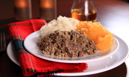 The Burns Night meal begins with a soup starter. This is usually a Scottish broth such as Cullen skink or a cock-a-leekie. This is followed with the haggis being brought in. As this is the main event and the most celebrated part of the meal, it is brought out on a silver plate while the piper plays. The Chair will them recite Address to a Haggis, it will be cut open when they reach the line “An’ cut you up wi’ ready slicht”. The Haggis is then traditionally served with neeps and tatties.